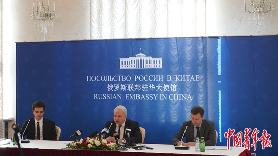 1月25日,俄罗斯驻华大使安德烈·杰尼索夫(中)在北京举行年度记者会。