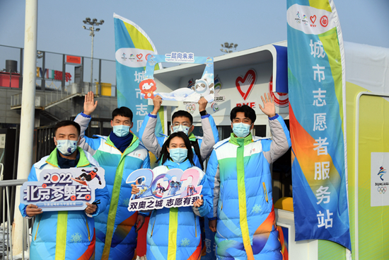 1月25日,城市志愿者代表在五棵松体育中心附近的城市志愿者服务站合影。