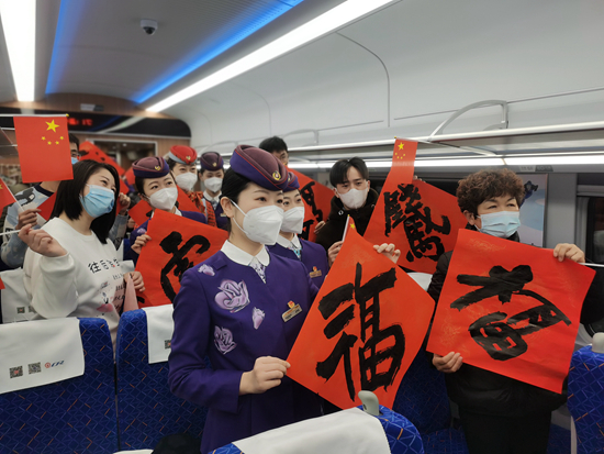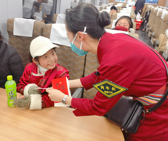 1月25日,在青岛开往龙口的C664次复兴号列车上,青岛客运段管内动车队的乘务员与旅客一起共同迎接新春佳节的到来。林峰 翟祚珩/摄