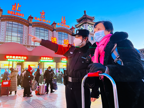 春运期间,北京铁路公安局北京公安处北京站派出所一方面加大日常站区巡逻巡控力度,另一方面拓宽为民服务的广度,丰富为民服务举措,努力营造“平安出行、有序出行、温馨出行”的良好氛围。图为民警杨小涵在站前广场解答旅客问题。李浩/摄
