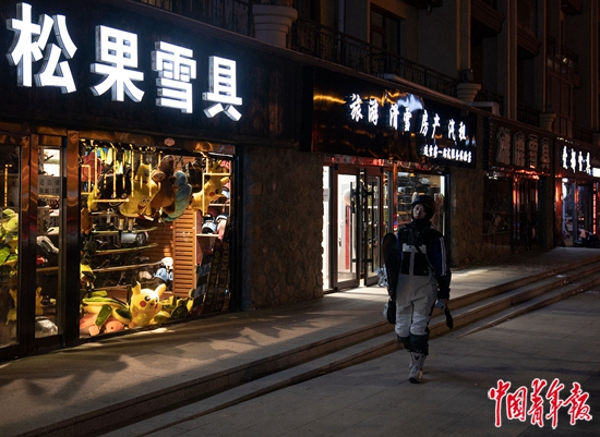 2021年11月20日晚,河北张家口崇礼,一名滑雪者全副武装,走过一整条街的雪具店。中青报·中青网记者 李峥苨/摄