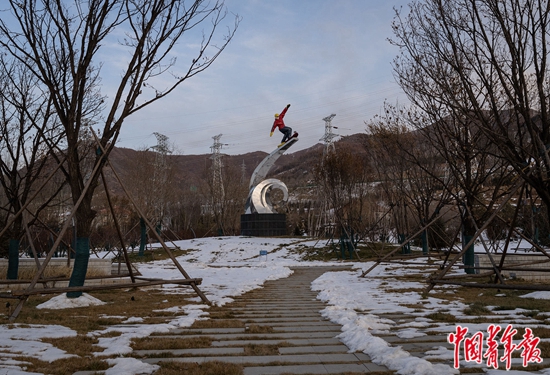 2021年11月19日,河北张家口崇礼,街头的滑雪者雕塑。中青报·中青网记者 李峥苨/摄