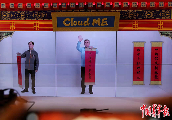 2月6日,2022北京新闻中心,国际奥委会主席巴赫与阿里巴巴董事会主席兼首席执行官张勇,通过全息舱阿里云聚(AlibabaCloudMe)向在场的新闻工作者拜年。中青报·中青网记者 陈剑/摄