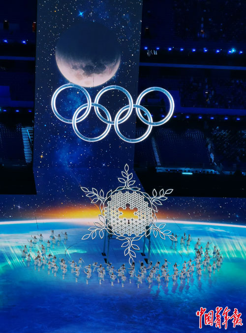 2月4日晚,第二十四届冬季奥林匹克运动会开幕式在北京国家体育场举行。各国运动员入场式后,所有代表团引导员手中的雪花在舞台中央汇成一朵巨大的雪花。中青报·中青网记者 李隽辉/摄