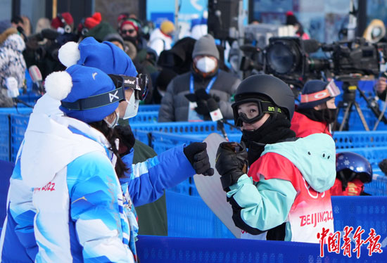 •     2月9日,河北张家口云顶滑雪公园,单板滑雪女子U型场地技巧资格赛,中国选手邱冷完成第二轮比赛后,与志愿者碰拳。她以第十二名进入决赛。中青报·中青网记者 李峥苨/摄