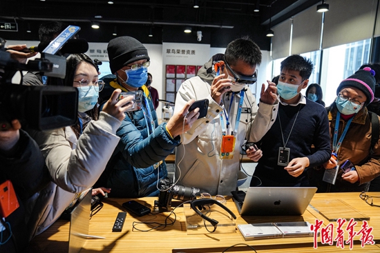 2月8日,北京“中关村壹号”园区,2022北京新闻中心“双奥之城新气象——中外媒体北京行”城市形象采访活动,一名记者在试戴专门为视障人群设计的智能眼镜。这是一家专注于高科技视力辅助产品自主研发的互联网公司,旨在为视力障碍人群提供由传感、算法、模型以及光学等核心技术集群所驱动的新一代视觉辅助类电子产品。产品可以帮助由于高度近视、青光眼、白内障等多种眼病造成的视力障碍人士。中青报·中青网记者 赵迪/摄