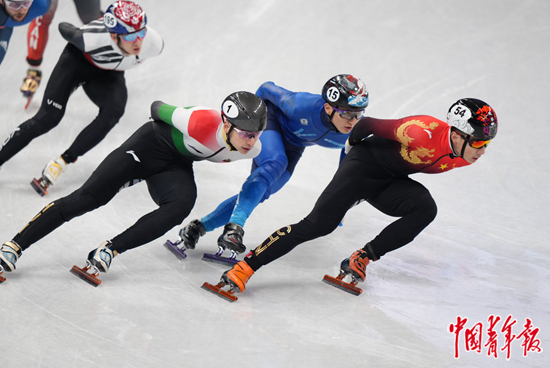 2月9日,北京冬奥会,中国选手任子威(右一)在短道速滑男子1500米决赛中。中青报·中青网记者 李隽辉/摄