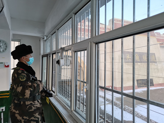 春节期间,武警青海总队官兵坚守战位,守护万家团圆。图为海西支队执勤一中队战士在青藏铁路关角隧道西洞口站岗执勤。王磊/摄