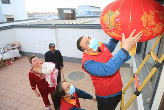 国网山东夏津县供电公司青年志愿者服务队帮助群众乔迁新居,与他们一家贴窗花、挂灯笼、欢度新年。李海涛/摄