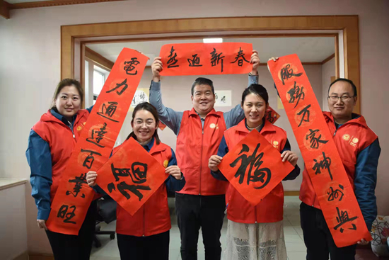 国网山东省滨州市博兴县供电公司团组织邀请书法志愿者为用户写春联。王凤兰/摄