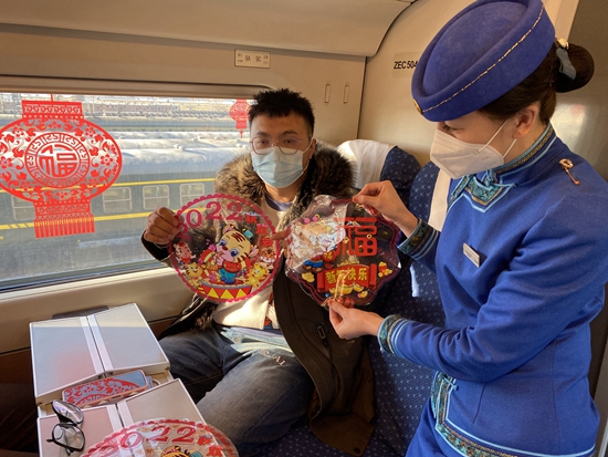 呼和浩特铁路局集团公司包头客运段高铁车队值乘的D6755次列车青年乘务员春节为旅客送福字讲防疫。王丽敏/摄