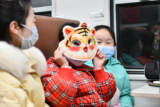 勉县元墩镇杨庄小学在校学生200余人,60%以上为留守儿童,很多孩子对大山外的世界十分好奇。图为中国铁路西安局汉中车务段支教老师孟璐在春运期间带着杨庄小学学生乘坐8361次公益慢火车,学生白思扬高兴地戴上虎娃面具让老师看。陈喆/摄