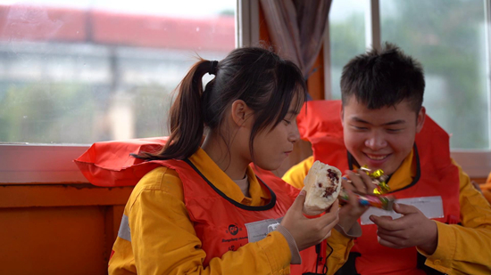 春运期间,柳州供电段电力线路工林诗琪(左)去支援男友杨靖育所在班组的工作,经历了人生中第一次实战爬杆。坐船回去的路上,杨靖育特意给林诗琪准备了她爱吃的零食。兰炳侣 林鹤 刘莹莹/摄