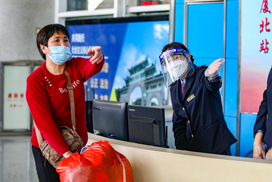 厦门北站小白鹭服务台内,客运员郭彩霞正在引导老年旅客进站乘车。李金明/摄