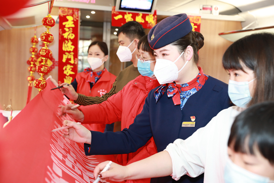2月8日,在G2217次列车上,郑州客运段高铁三队列车长李怡霖和旅客一起在“崇尚节约为荣,向餐饮浪费说不”条幅上签名。张强 陈明静 任良/摄