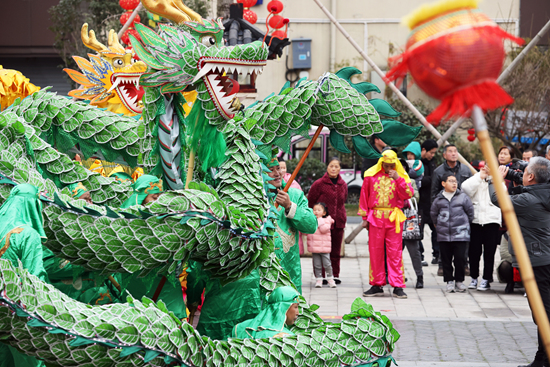 2月10日,浙江省湖州市,德清县乾元镇孔庙广场,村民在表演舞龙。