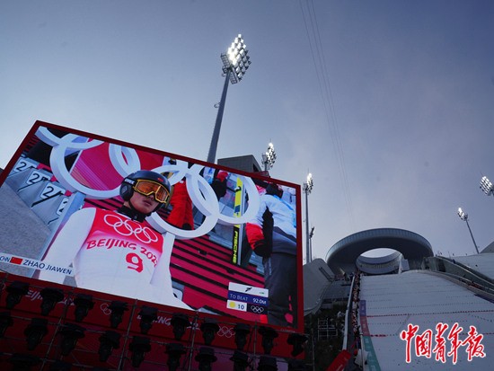 2月9日,河北张家口国家跳台滑雪中心的大屏幕上,中国选手赵嘉文在北欧两项的跳台滑雪标准台比赛轮中。赵嘉文的参赛,是中国选手第一次获得冬奥会北欧两项参赛资格,已经创造历史。在北京冬奥会开幕式上,赵嘉文与中国女子越野滑雪运动员迪妮格尔·衣拉木江共同担任最后一棒火炬手,将火炬嵌入了雪花形状的主火炬台中。 中青报·中青网记者 李峥苨/摄