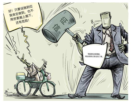 北京市近日印发《关于进一步加强本市电动自行车全链条管控的实施方案》,提出力争全市居住区充电设施建设基本覆盖。为杜绝电动自行车“上楼入户”的危险行为,除了劝阻、制止和报告之外,拒不改正、情节严重的,还将逐步纳入征信体系。(《北京日报》2月17日) 漫画:徐简