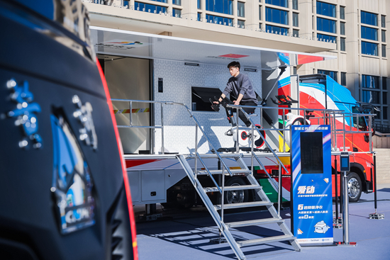 刘希平介绍,这辆车配备了双牵引头,一台是混合动力牵引头,一台是最新型的氢能源牵引头,以适应不同的应用场景。车顶采用了光伏发电设计,以节能环保又高效的方式保障赛事进行。