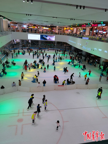 长沙国金中心的大零溜冰场于2018年5月开业。这座以国际标准建设的专业综合性溜冰场,自开业以来,工作日每天的客流达到400人次,周末和节假日每天达到800人次。今年2月13日,记者在国金中心看到,200多名青少年在场内尽情玩耍,不少家长也带着孩子在场内亲子互动。由于地处大型购物中心,冰场除了自身消费火爆以外,还为商超的住宿、餐饮及购物带来了大批客源。