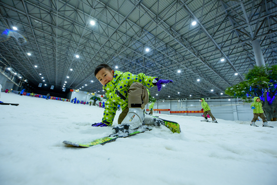 滑雪场里的小男孩。长沙“三只熊冰雪王国”室内滑雪场供图