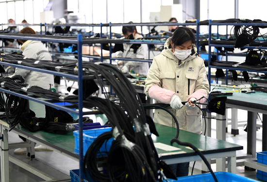 2月16日,工作人员在汊河轨道交通装备产业园的一家轨道交通装备企业生产线上忙碌。