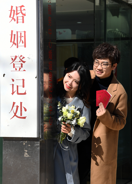 2月22日,北京市海淀区,一对新人领取结婚证后拍照留念。当日是2022年2月22日星期二。因“2”与“爱”谐音,很多新人选择在当天登记结婚。新华社记者 任超/摄
