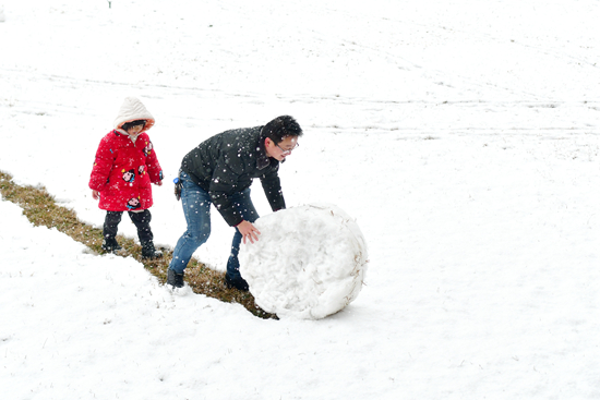 2月22日,湖南省娄底市双峰县荷叶镇,一对父女在滚雪球。日前,受冷空气影响,我国南方地区迎来大范围雨雪天气,中央气象台2月22日18时发布暴雪蓝色预警。李建新/视觉中国