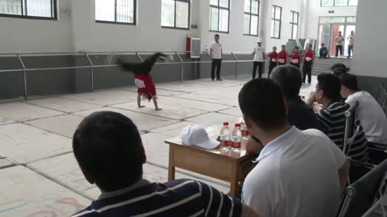 这是套路动作中的一个,套路是一种武术动作组合。起跳要稳,落地要轻,为了加强身体控制力,他们有时会在室外的水泥地上练习。