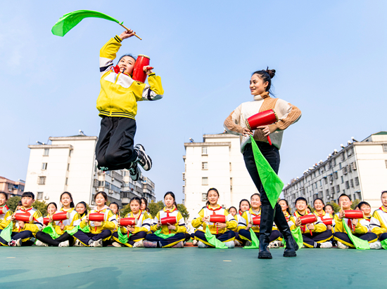 2月28日,江苏省南通市海安市教师发展中心附属小学乡村复兴少年宫的孩子在老师指导下学习“海安花鼓”。该小学将省级非遗项目“海安花鼓”纳入体育课及课后服务课程,助力“双减”政策,促进孩子强身健体。 翟慧勇/视觉中国