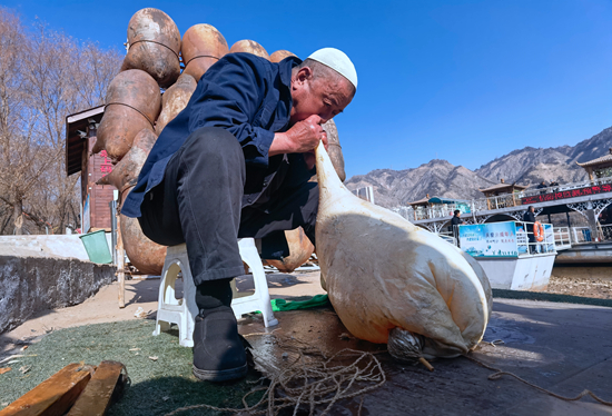 2月24日,兰州,70多岁的甘肃省级非遗“兰州羊皮筏子“的传承人张德宝,在黄河边制作羊皮筏子。羊皮筏子俗称排子,为黄河沿岸民间保留下来的一种古老的摆渡工具,现已成兰州黄河旅游观光的一大特色。 视觉中国供图