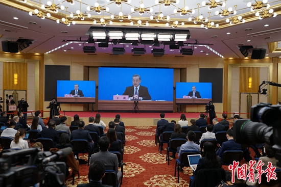 3月7日,北京梅地亚中心,国务委员兼外交部长王毅通过屏幕回答记者提问。出于疫情防控需要,记者会在人民大会堂举行,中外记者在梅地亚中心通过网络视频进行采访。中青报·中青网记者 李强/摄