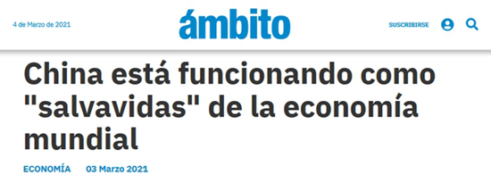 阿根廷《金融界报》3月3日发表题为《中国在世界经济中扮演“救生圈”的角色》文章。文中说,中国是世界上大多数国家的主要经济合作伙伴,因此中国经济的快速恢复对全球经济有着至关重要的作用。(网站截图)