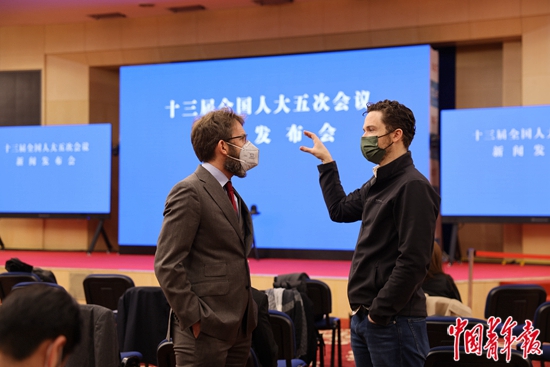 3月4日,北京梅地亚中心,十三届全国人大五次会议新闻发布会分会场,两名外媒记者在会前交谈。中青报·中青网记者 曲俊燕/摄