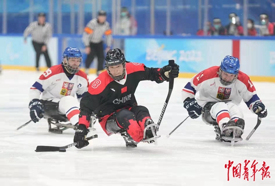 3月9日,北京,国家体育馆,中国残奥冰球队队员与捷克队队员在拼抢中。当晚,中国残奥冰球队以4∶3力克捷克队,赢得半决赛门票。半决赛中,中国队将迎战卫冕冠军美国队。中青报·中青网记者 李隽辉/摄