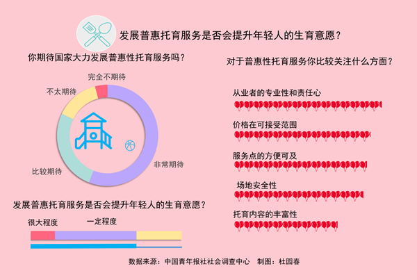 在全国两会期间,中国青年报社社会调查中心联合腾讯新闻,对3037名受访者进行的一项调查显示,82%的受访者期待国家大力发展普惠托育服务。受访者普遍关注的方面是,从业者的专业性和责任心、价格在可接受范围、服务点方便可及。70%的受访者认为发展普惠托育服务会提升年轻人生育意愿。