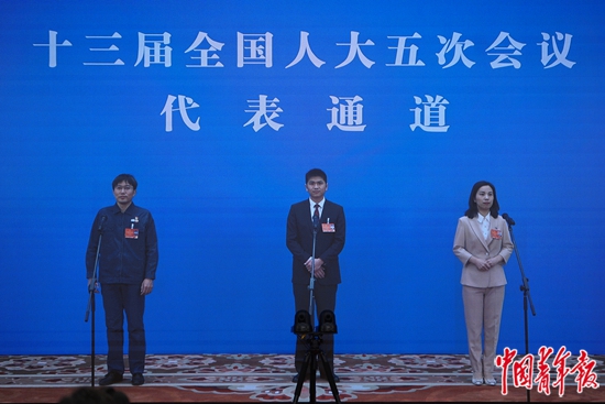 3月8日,北京梅地亚中心,十三届全国人大五次会议第二场“代表通道”分会场,3名80后全国人大代表(左起)中国石油锦西石化分公司车工高级技师王尚典,江西九江柴桑区新合镇党委副书记、镇长李洪亮,山东省德州市恒丰集团高级技师王晓菲通过屏幕回答记者提问。中青报·中青网记者 李强/摄
