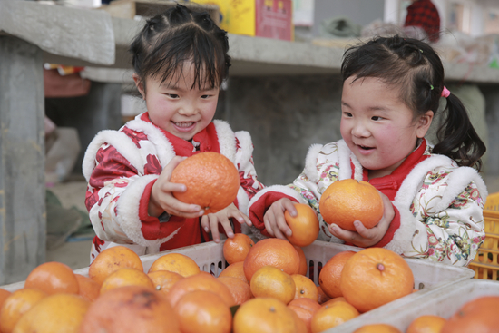 3月12日,两名小朋友在湖南省邵阳市隆回县六都寨镇丁山村集市挑选橘子。