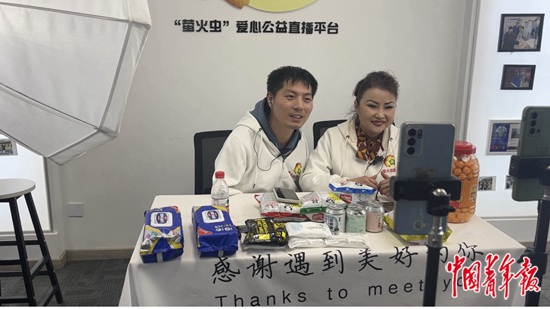 任建伟(左)在“萤火虫”直播平台直播。 中青报·中青网见习记者 王喆/摄
