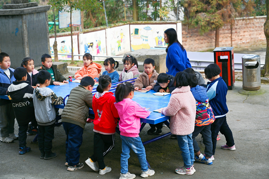 3月10日,贵州黔东南锦屏县高坪小学一年级的孩子在颂读古诗词。 视觉中国供图