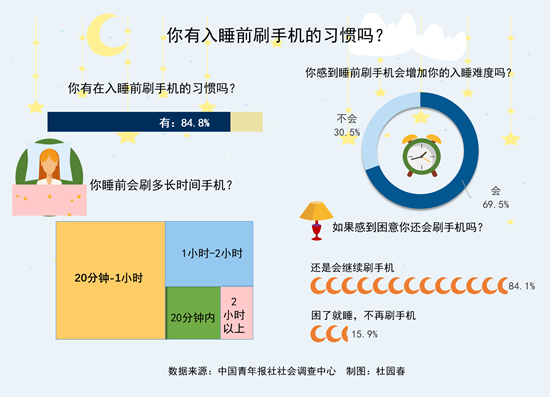 69.5%的受访青年直言睡前刷手机会增加入睡难度。