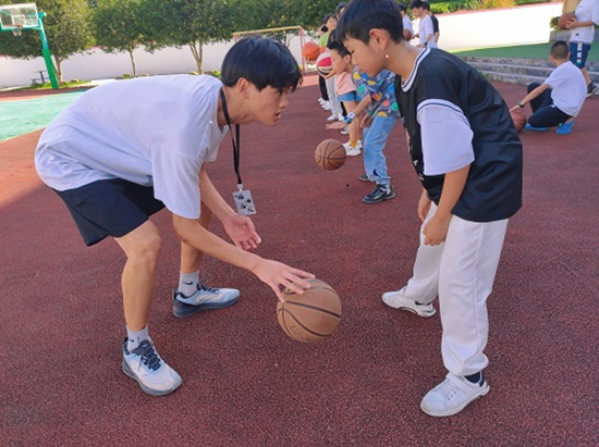2020年宁德师范学院后山夜校赤溪成长训练营文体老师指导学生篮球技巧。宁德师范学院供图