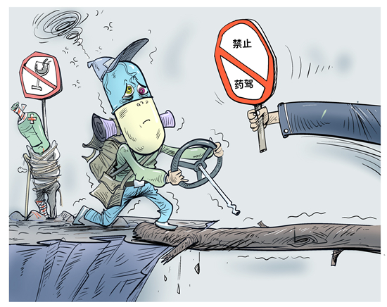 近年来,因“药驾”引发的交通事故不在少数。从社会危害程度看,“药驾”与“酒驾”“毒驾”并没有太大区别,但受到的惩处往往较轻。如果没有造成严重的伤人亡人等后果,“药驾”一般不会触犯刑法进而构成犯罪。这也是“药驾”愈演愈烈的原因之一。(《工人日报》3月24日)漫画:徐简