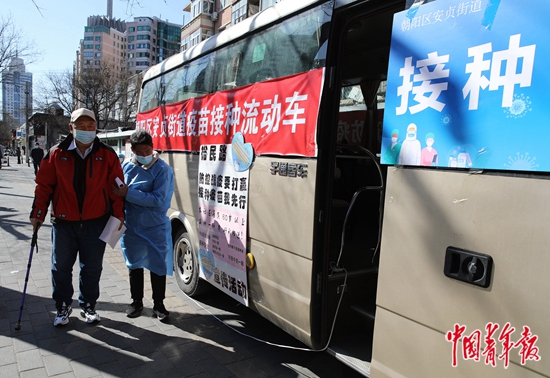 3月31日,北京市朝阳区裕民路社区,志愿者搀扶老人来到疫苗接种流动车。据介绍,为打通老年人新冠疫苗接种障碍,解决“最后一公里”问题,安贞街道将疫苗接种流动车开进社区,组织开展“免费义诊+第一针疫苗接种”活动,就近在社区开设老年人疫苗接种专场,并为居民提供测量血压、心理咨询、中医诊脉等服务。 中青报·中青网记者 陈剑/摄