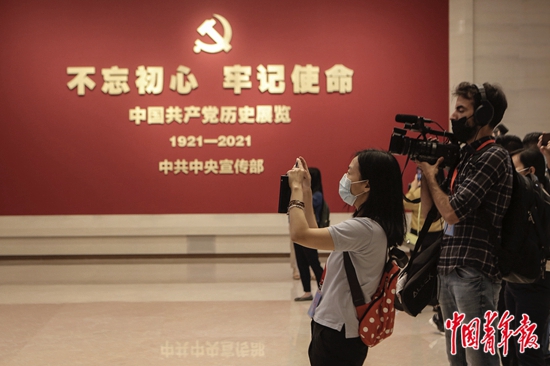 2021年6月25日,北京,中国共产党历史展览馆首展“‘不忘初心 牢记使命’中国共产党历史展览”现场,中外媒体记者在进行拍摄报道。 中青报·中青网记者 孔斯琪/摄