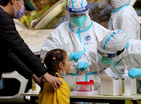 4月4日,在上海市松江区一小区内,浙江援沪医疗队队员为居民进行核酸检测采样。为尽快遏制疫情扩散蔓延,当日,上海在全市范围内开展一次核酸检测。新华社记者 刘颖/摄