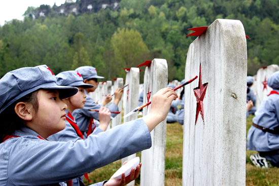 在川陕革命根据地红军烈士陵园,少先队员们用毛笔蘸上油漆,一点一点地把褪色的五角星重新描红。当天,师生们一共为450块无名烈士墓碑描红了五角星。白色的墓碑在山坡上整齐排列,五角星重现了红色的光泽。