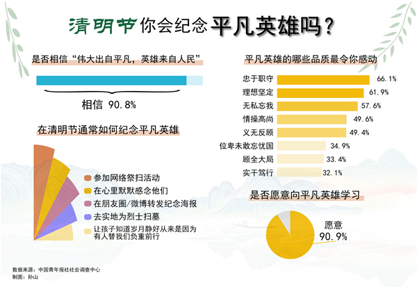 在今年清明节,中国青年报社社会调查中心联合问卷网(wenjuan.com),对2048名受访者进行的一项调查显示,90.8%的受访者相信“伟大出自平凡,英雄来自人民”。忠于职守(66.1%)、理想坚定(61.9%)是平凡英雄身上令受访者感动的品质。90.9%的受访者愿意向平凡英雄学习。