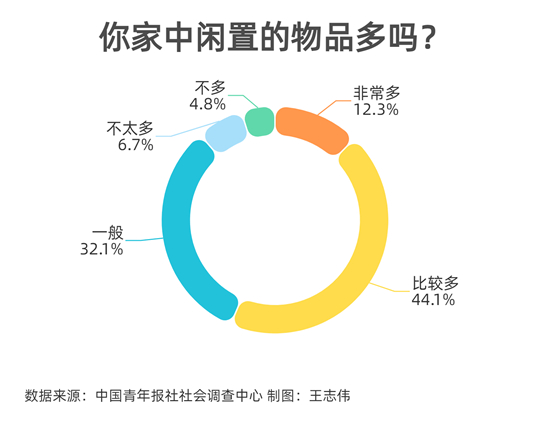调查显示,56.4%的受访者表示家中闲置物品多,其中12.3%的受访者表示非常多。还有32.1%的受访者表示一般,11.5%的受访者表示不多。