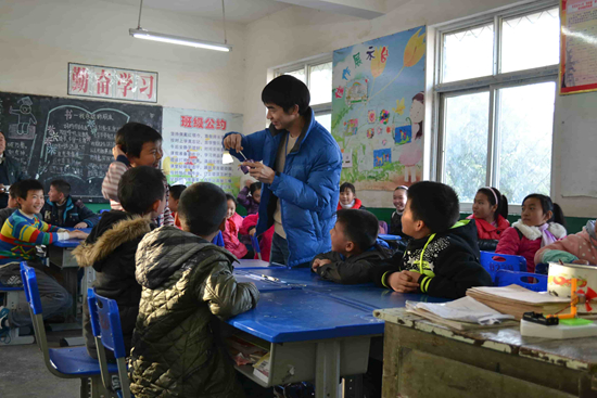 在荆门市仙居中心小学,余为伟为留守儿童开展公益科普活动。 受访者供图